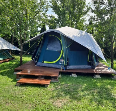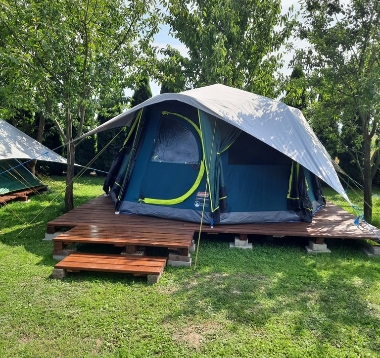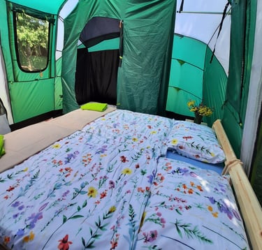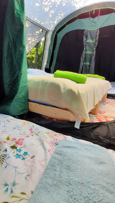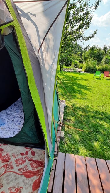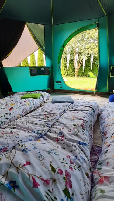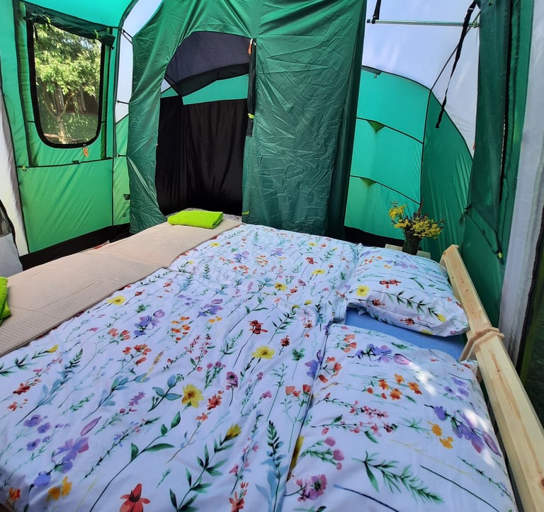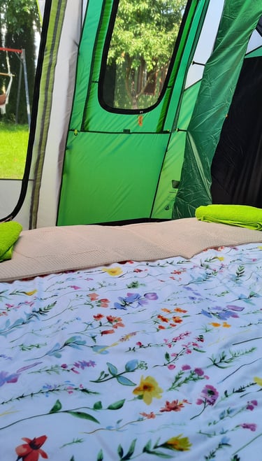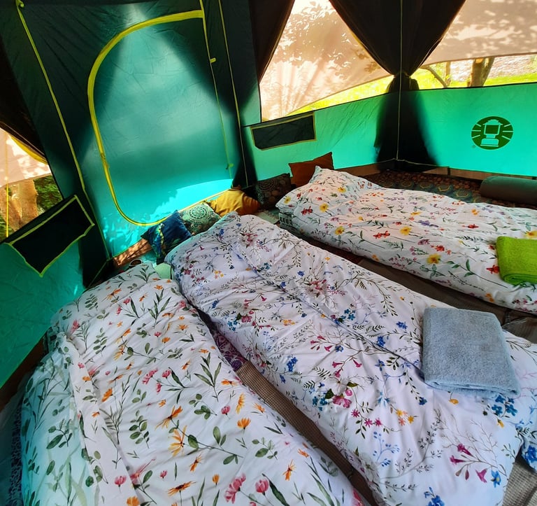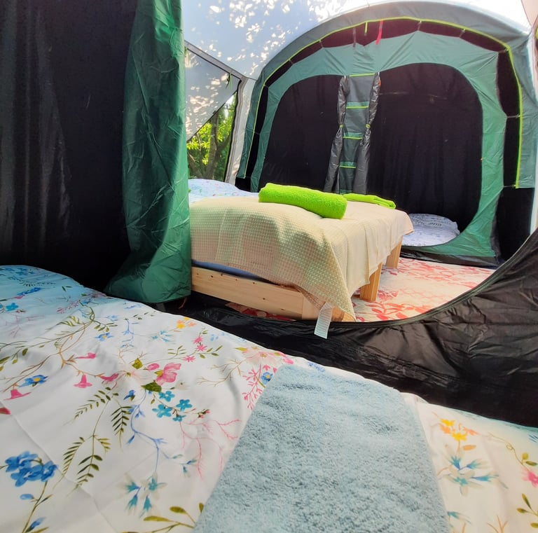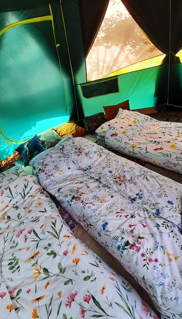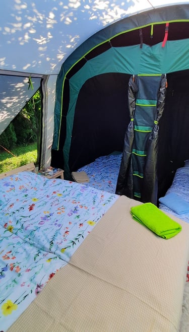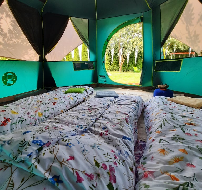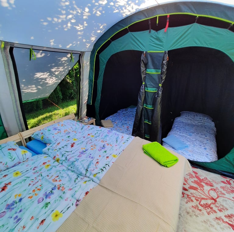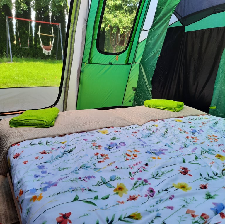 Mamy komfortowe namioty i łóżka/materace, a nawet pościel i ręczniki.